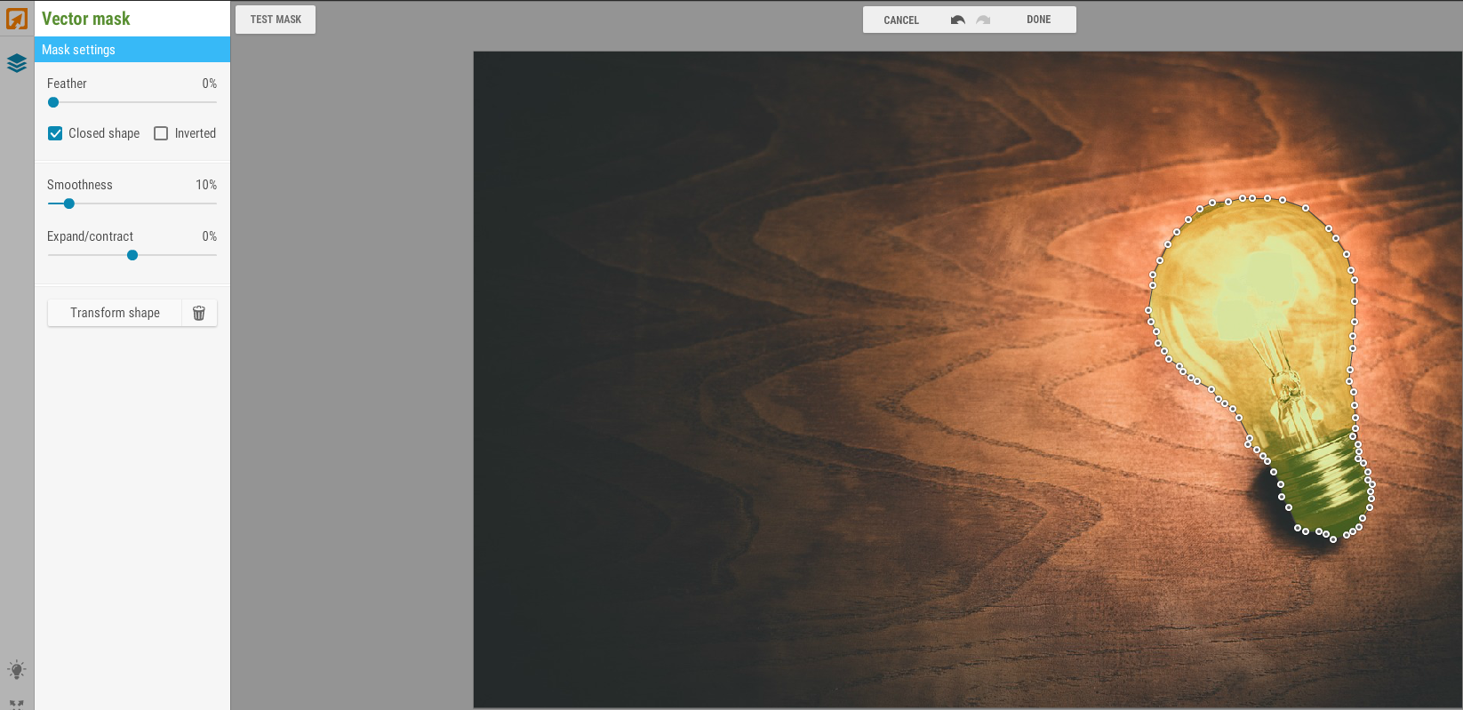 You can move each individual dot to make it as precise as possible. You can also use the “feather” tool on the left under “Mask Settings” to smooth the edge of your image. Click on “TEST MASK” on the top left, iPiccy will provide a preview to help you decide if that is what you want your mask to look like. If you are satisfied with your mask, click on “DONE” at the top middle.